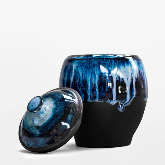 Handmade Black Porcelain Urn - Blue Streaks On Black Gloss